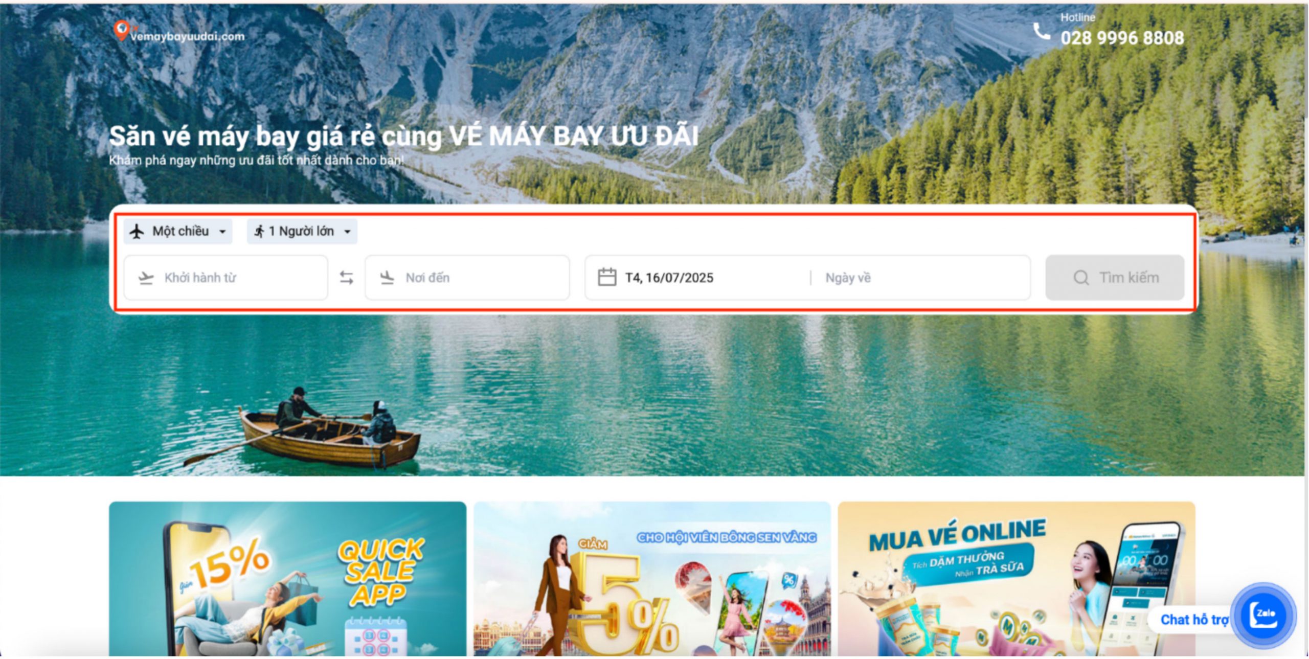 Bước 1: Truy cập website www.vemaybayuudai.com lựa chọn hành trình cần đặt, ngày khởi hành / ngày về, số lượng khách, sau đó bấm “Tìm kiếm”