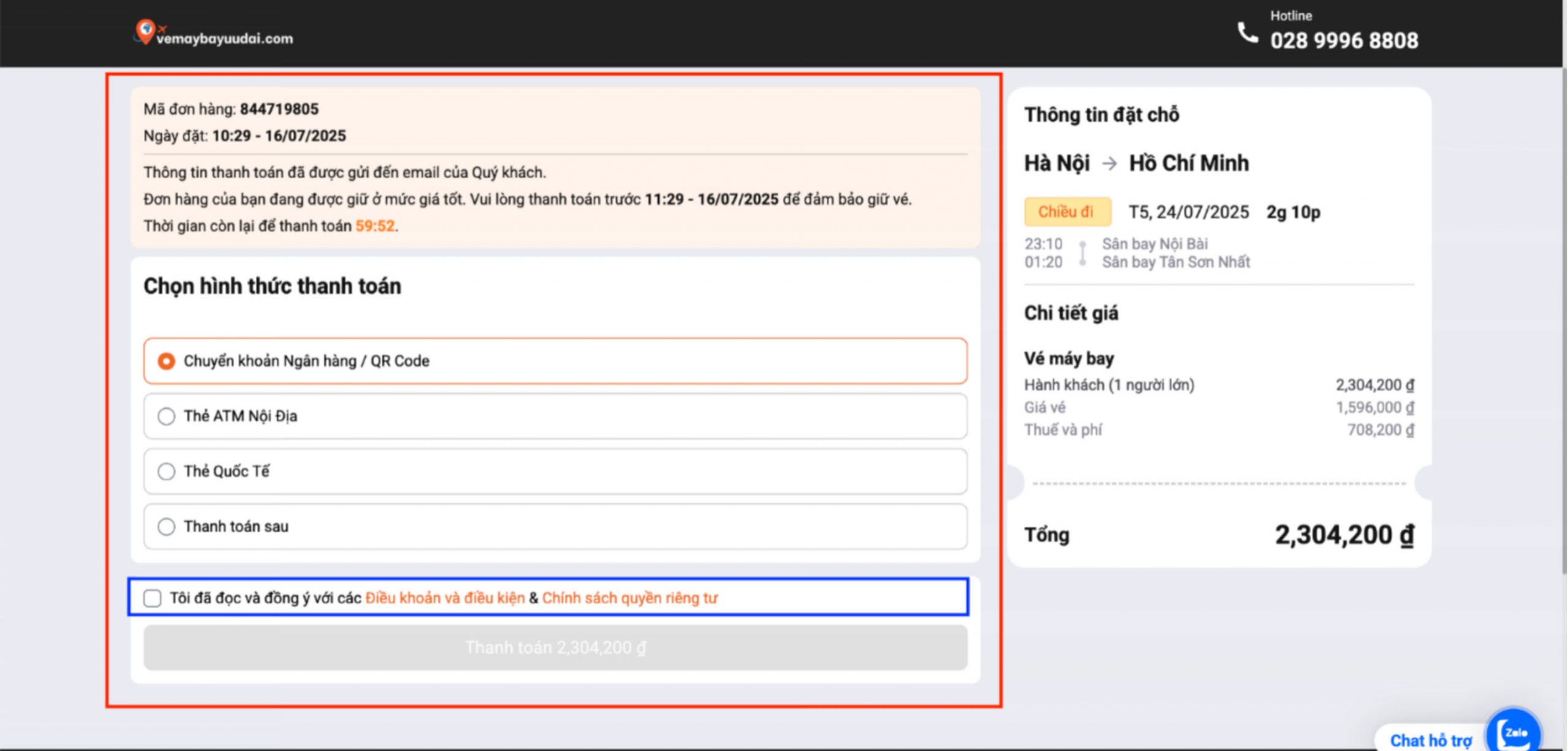 Bước 4: Chọn hình thức thanh toán phù hợp và tick vào ô “Tôi đã đọc và đồng ý với các Điều khoản và điều kiện & Chính sách quyền riêng tư” sau đó bấm Thanh toán.